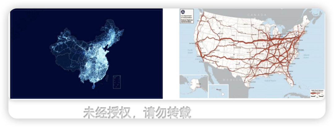 (左图:中国物流重卡卫星图 右图:美国高速公路流量图)PS:可能上述图片是2019年前后某研究机构的,具体年份和来源不确定,但是已经足以看到很多背后的产业差异了