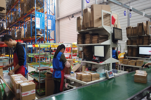 货品分拣出库后进入复验并上包装环节,全程由智能标签、数字化管控。不同的商品根据体积、重量、包装特点、注意要求等在系统里面已设定好了数据,操作人员通过RF手持设备扫描商品标签,系统就会提示相应的包装箱型号和材料,包装人员以系统为导向操作极大提升了包装的准确识别和效率。据不完全统计包装效率较之以往提升50%。