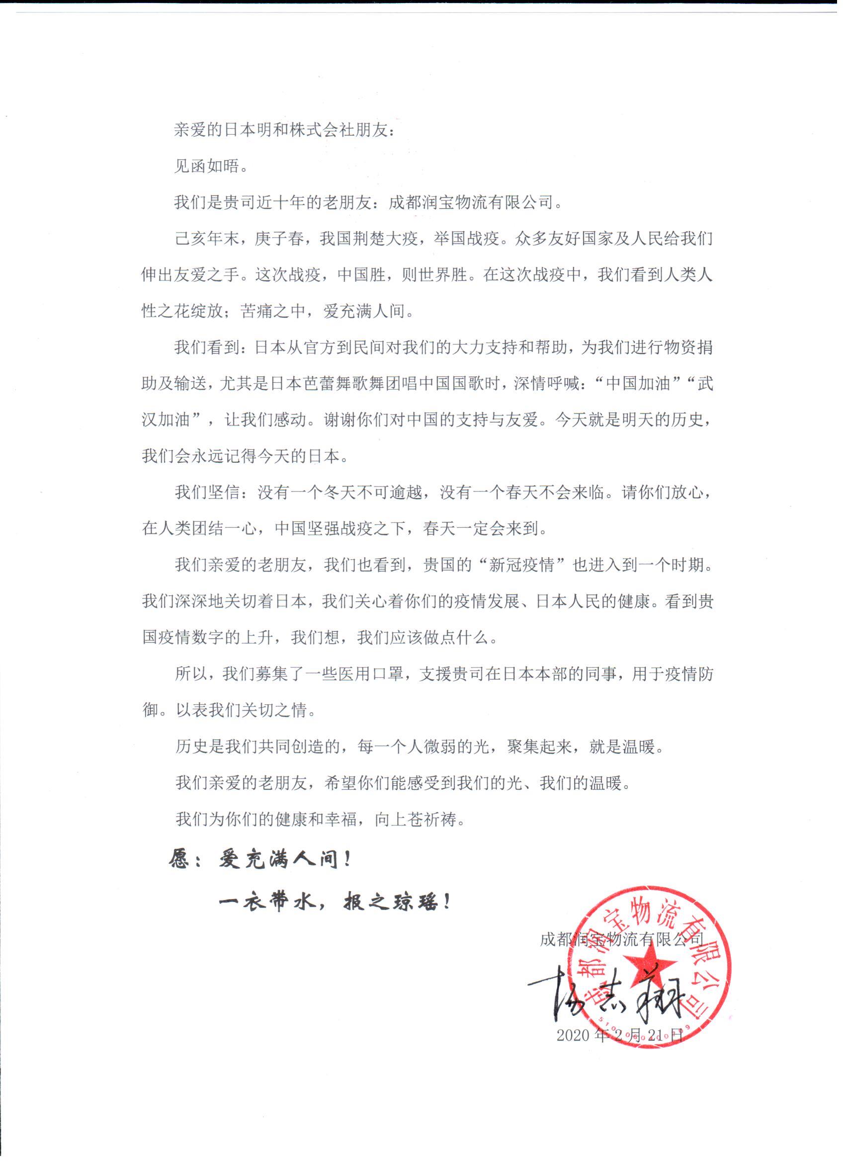 润宝物流第一时间向近十年的老伙伴、老朋友:日本明和株式会社 发出慰问及募集口罩捐赠